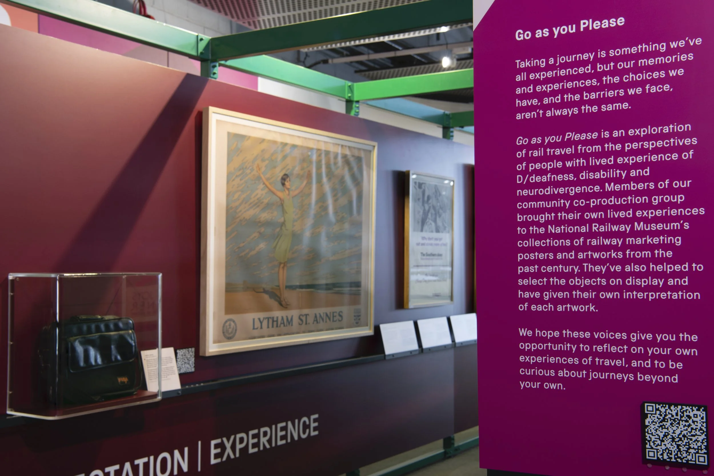 I was the curator of the exhibition ‘Go as you Please’ at the National Railway Museum. I worked with a community co-production group of people with lived experience of disability, using the museum’s art collection to tell stories of disabled peoples experiences of rail travel. This work was part of the Curating for Change project, a programme which supported disabled curators in museums across England to develop new exhibitions about disability stories.